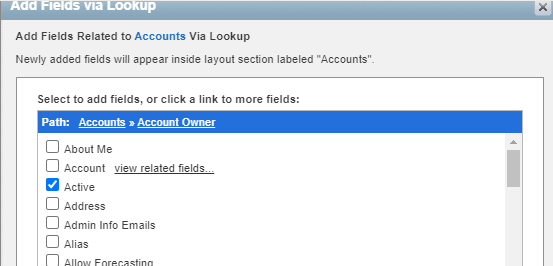 Essentially what we want is the field that is available by lookup to the account owner, contact owner, and lead owner via the user object that is called “Active”. Be careful– your org may well have a standard field on contacts or accounts called “Active”- that’s not it! These screenshots show how an admin would add these fields to a custom report type of “Accounts with or Without Contacts” that incorporates the Contacts > Contact Owner > Active field and the Accounts > Account Owner > Active field.